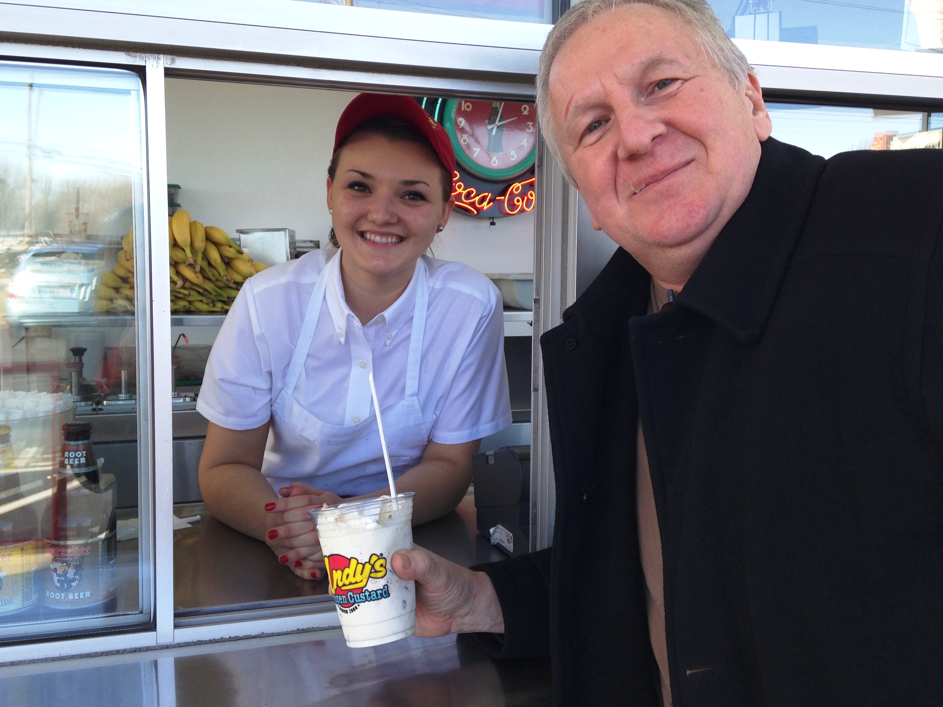 First stop was Andy’s, for frozen custard. Not to be beaten by Ted Drewes being closed yesterday, we happened upon Andy’s when entering Springfield last night. Ok, so here’s the deal. Frozen custard is made like custard from cream and eggs, and the guy in our hotel said that this makes it healthier than ice cream. Well, I have to say, I couldn’t taste the difference and it certainly didn’t taste healthy. But whatever. So you can buy it as a cone (chocolate and vanilla only, no toppings allowed, as a sundae (any flavour, any topping) or as a concrete. The concrete sounded intriguing and exotic, so that’s what we had. Basically, it’s the frozen custard with the toppings mixed all the way through rather than on the top, in a cup with a spoon. It’s all in the marketing!